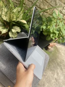 Laptop Studio máy ngoại hình tổng quan như hàng mới, dưới đít máy có 1 vết móp nhẹ do vận chuyển, còn lại keng new, mọi chức năng bình thường